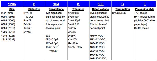偏差:B=±0.1pF、C=±0.25pF、D=±0.5pF、F=±1%、G=±2%、J=±5%、K=±10%、M=±20%、Z=-20%+80%