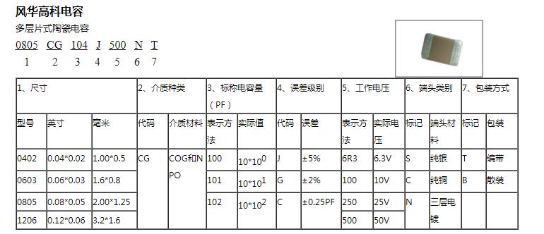 風(fēng)華電容額定電壓表示方法:風(fēng)華0805 CG 101 J 500 NT 如圖:第五部分為500為額定電壓;
