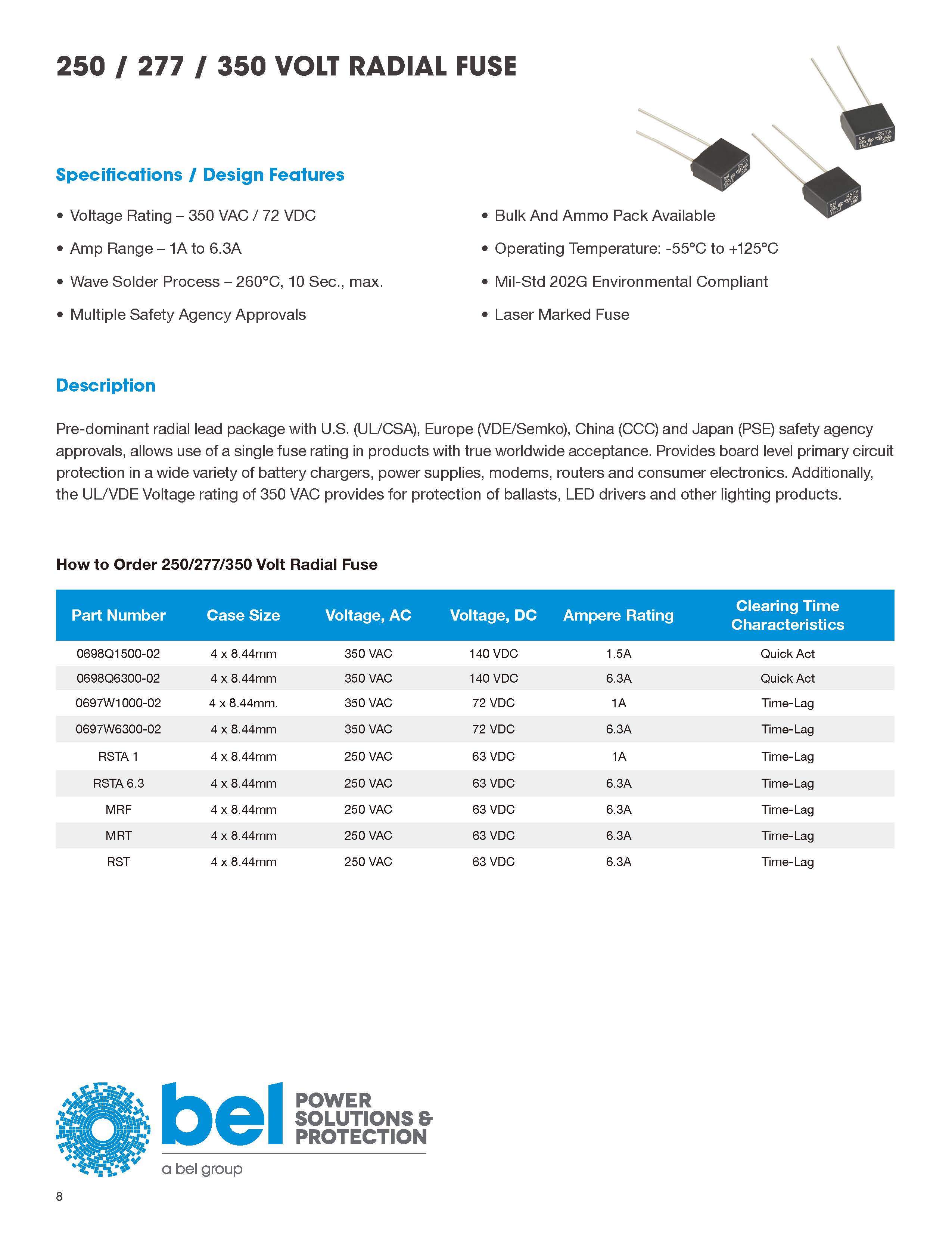 與美國(guó),歐洲(VDE / SEMKO),中國(guó)(CCC)和日本(PSE)安全機(jī)構(gòu)的預(yù)先顯性徑向鉛包裝批準(zhǔn),允許使用具有真正全球驗(yàn)收的產(chǎn)品中的單一保險(xiǎn)絲等級(jí)。 提供板級(jí)主電路在各種電池充電器,電源,調(diào)制解調(diào)器,路由器和消費(fèi)電子產(chǎn)品中保護(hù)。 此外,350 VAC的UL / VDE額定等級(jí)可提供鎮(zhèn)流器,LED驅(qū)動(dòng)器和其他照明產(chǎn)品的保護(hù)。