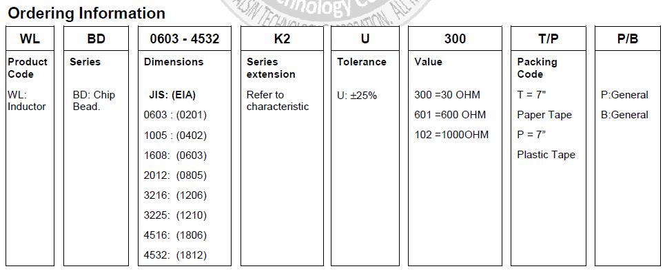 華科貼片磁珠命名規(guī)則:例如:WLBD0603-4532K2U300T/PPB