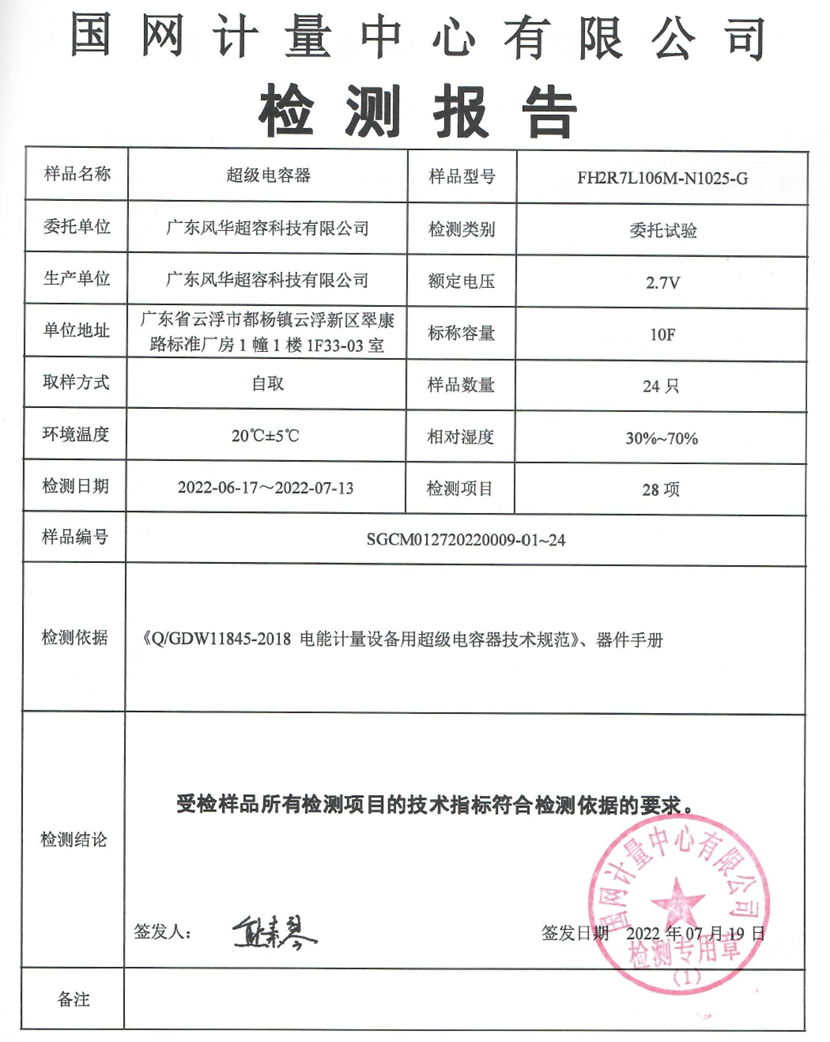 7月下旬,風(fēng)華高科超級(jí)電容器產(chǎn)品在國(guó)網(wǎng)計(jì)量中心順利通過測(cè)試認(rèn)證,該認(rèn)證表明風(fēng)華高科超容產(chǎn)品完全符合國(guó)家電網(wǎng)智能電表的嚴(yán)格要求。