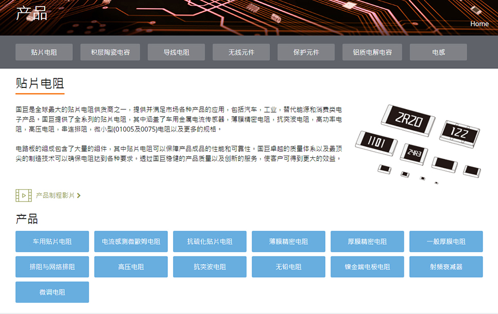 作為提供「一次購(gòu)足服務(wù)」的大型被動(dòng)組件供貨商,國(guó)巨提供完整的產(chǎn)品線,包括芯片電阻、積層陶瓷電容、導(dǎo)線電阻、無(wú)線組件、鋁質(zhì)電解電容和電感。國(guó)巨的多元化產(chǎn)品皆針對(duì)主要的垂直市場(chǎng)研發(fā),包括手機(jī)、平板計(jì)算機(jī)、網(wǎng)絡(luò)、家電、工業(yè)/電力、再生能源、醫(yī)療和汽車應(yīng)用。