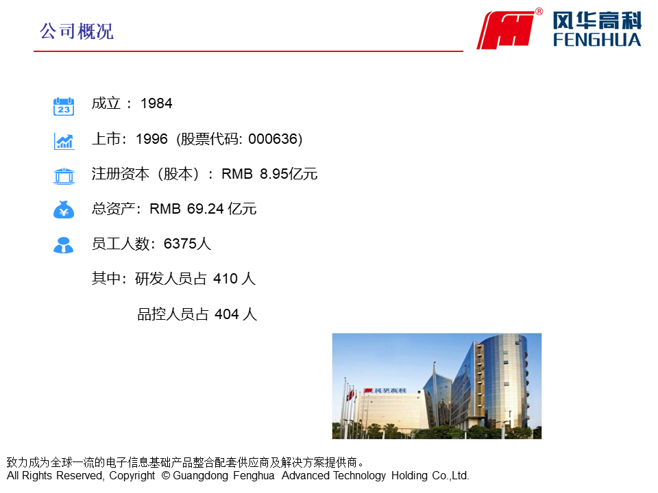 廣東風(fēng)華高新科技股份有限公司(證券簡稱風(fēng)華高科,證券代碼000636)成立于1984年,是一家專業(yè)從事高端新型元器件、電子材料、電子專用設(shè)備等電子信息基礎(chǔ)產(chǎn)品的高新技術(shù)企業(yè),1996年在深圳證券交易所掛牌上市。風(fēng)華高科自進(jìn)入電子元器件行業(yè)以來,實現(xiàn)了跨越式的發(fā)展,現(xiàn)已成為國內(nèi)最大的新型元器件及電子信息基礎(chǔ)產(chǎn)品科研、生產(chǎn)和出口基地,擁有自主知識產(chǎn)權(quán)及核心產(chǎn)品關(guān)鍵技術(shù)的國際知名新型電子元器件行業(yè)大公司。