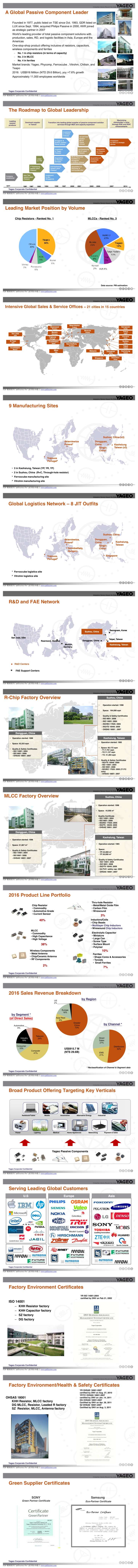 國巨現(xiàn)今為全球第一大芯片電阻器 (R-chip) 制造商、全球第三大積層陶瓷電容 (MLCC) 供貨商,在磁性材料 (ferrits) 領(lǐng)域則名列全球第三。國巨目前在全球18個國家有27個行銷/服務(wù)據(jù)點、8座生產(chǎn)基地、5座 JIT即時發(fā)貨中心,及3個研發(fā)中心。位于歐洲的飛磁(Ferroxcube) 和 Vitrohm 也隸屬于國巨集團(tuán),分別以生產(chǎn)磁性材料和傳統(tǒng)電阻為主。